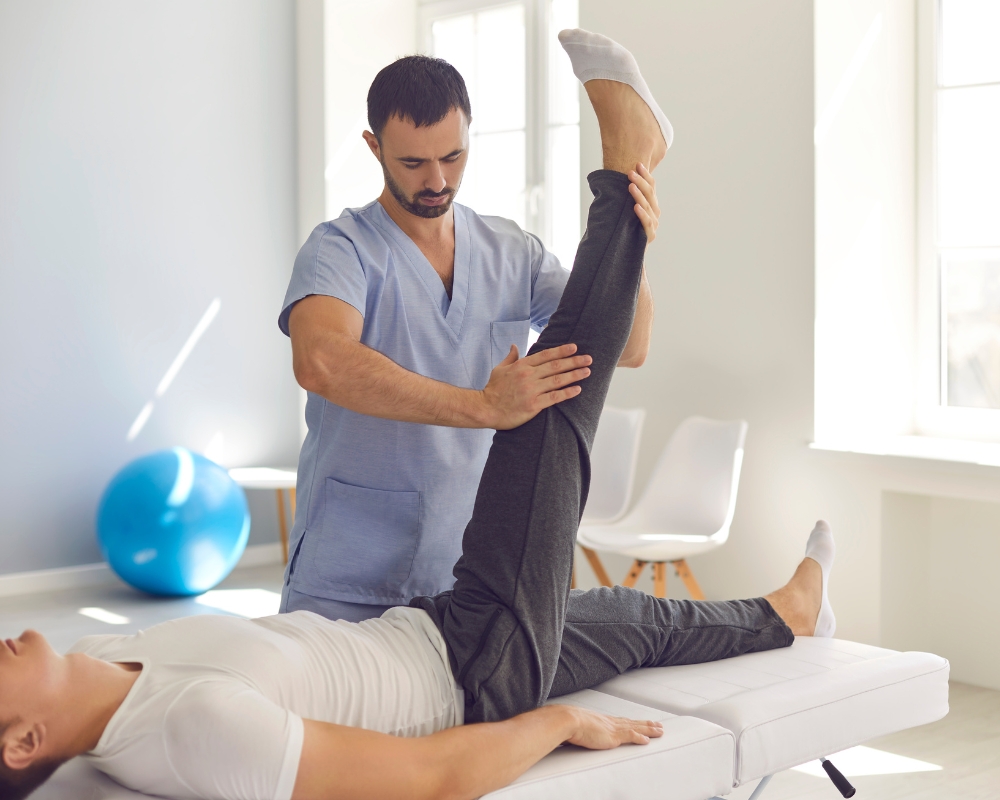 - Nằm trên giường, 1 chân duỗi thẳng, chân còn lại co