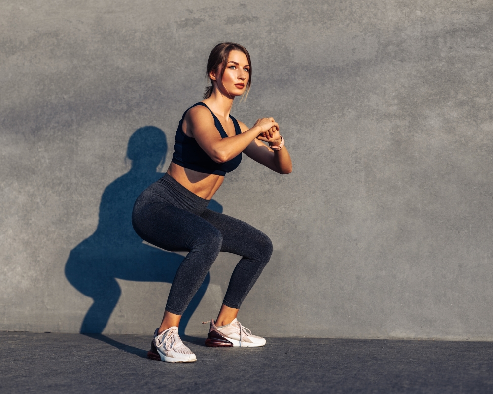 - Từ từ khuỵu đầu gối song song với mặt sàn, đồng thời điều chỉnh tư thế sao cho lưng hơi ngả về trước