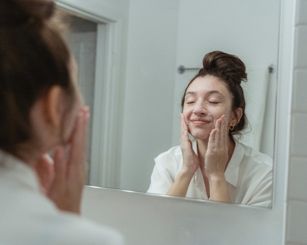 Chọn sản phẩm dịu nhẹ, có độ pH từ 5.5 - 6.5, không chứa cồn hay sulfate. Chỉ nên rửa mặt 2 lần/ngày, nếu rửa quá nhiều làm mất hàng rào bảo vệ da tự nhiên, khiến da tiết dầu nhiều hơn.