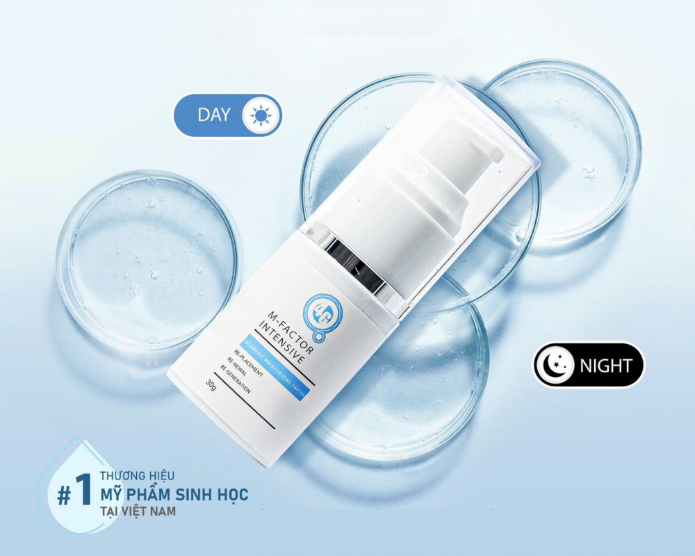 - Bước 4: Thoa serum dưỡng ẩm M - Factor Intensive với bảng thành phần giàu dưỡng chất gồm HA dưỡng ẩm 2 cấp độ phân tử, chiết xuất tảo Spirulina Việt Nam, đường tảo Trehalose, Glycogen, Glycerin… giúp cấp ẩm đa tầng, nuôi dưỡng da ẩm mịn & phục hồi thương tổn từ gốc.