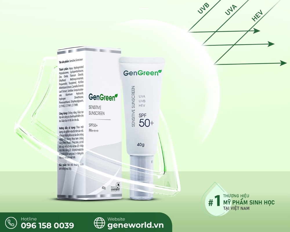 Là sản phẩm của thương hiệu mỹ phẩm sinh học hàng đầu Việt Nam - Geneworld, kem chống nắng cho bà bầu Sensitive Sunscreen sở hữu chỉ số của kem chống nắng phổ rộng SPF 50+, PA++++ cho hiệu quả bảo vệ da mẹ bầu khỏi các yếu tố tia UV, HEV tác động gây sạm nám, cháy nắng, lão hóa da hiệu quả. Đồng thời, sản phẩm có khả năng hỗ trợ nâng tone, che khuyết điểm, làm mờ các vết sạm nám trên da, cho lớp finish hoàn hảo, tăng thêm sự tự tin cho mẹ bầu. Đặc biệt, bảng thành phần của Sensitive Sunscreen lành tính, không chứa chì, không chất độc hại cho da, bao gồm cả làn da nhạy cảm.