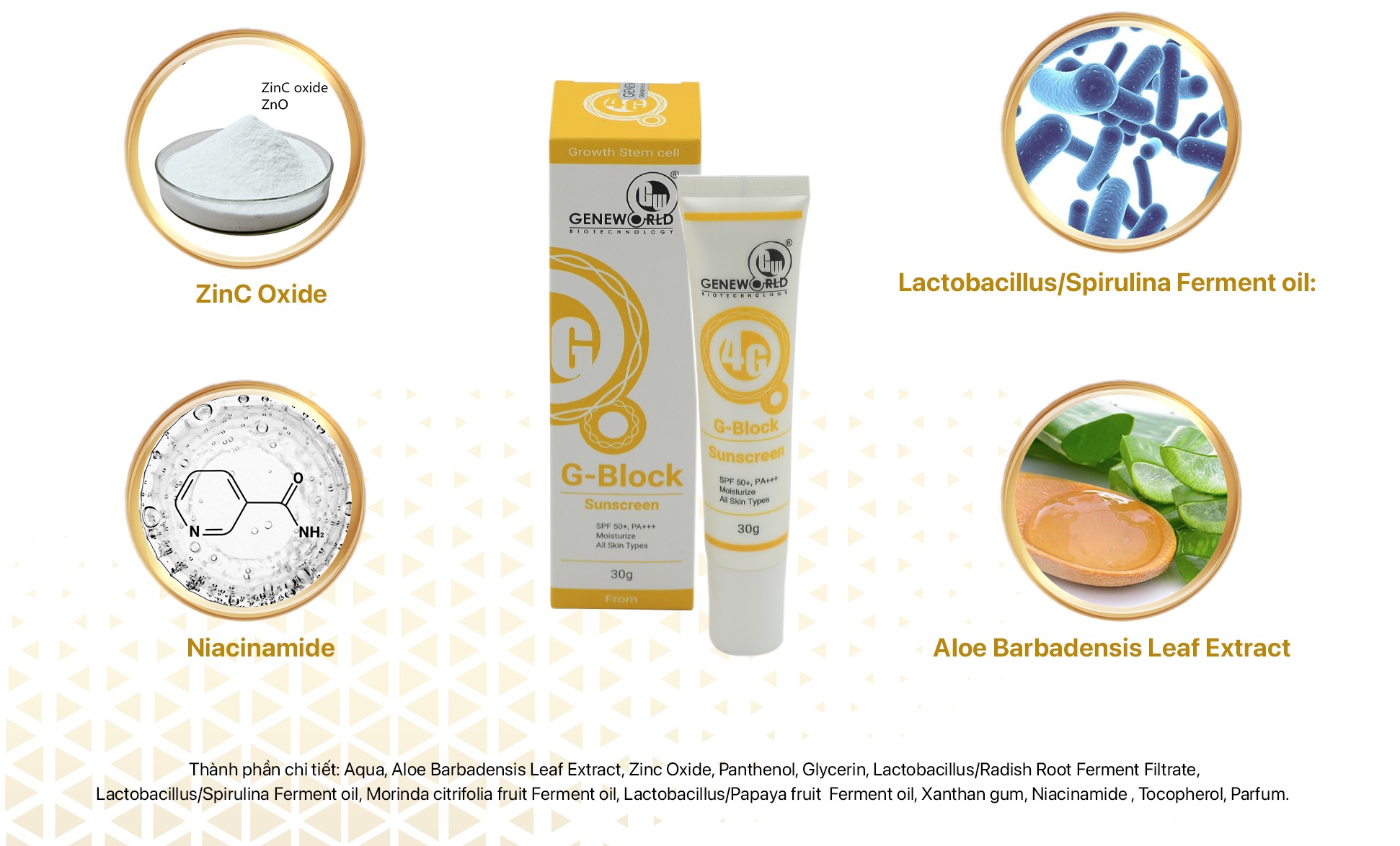 G - Block là kem chống nắng vật lý phổ rộng với chỉ số SPF 50+, PA+++ bảo vệ da tối ưu suốt nhiều giờ liền. Sản phẩm được nghiên cứu và sản xuất phù hợp để sử dụng làm kem chống nắng dành cho bà bầu, kem chống nắng cho da treatment, cho các loại da nhạy cảm, da khô.