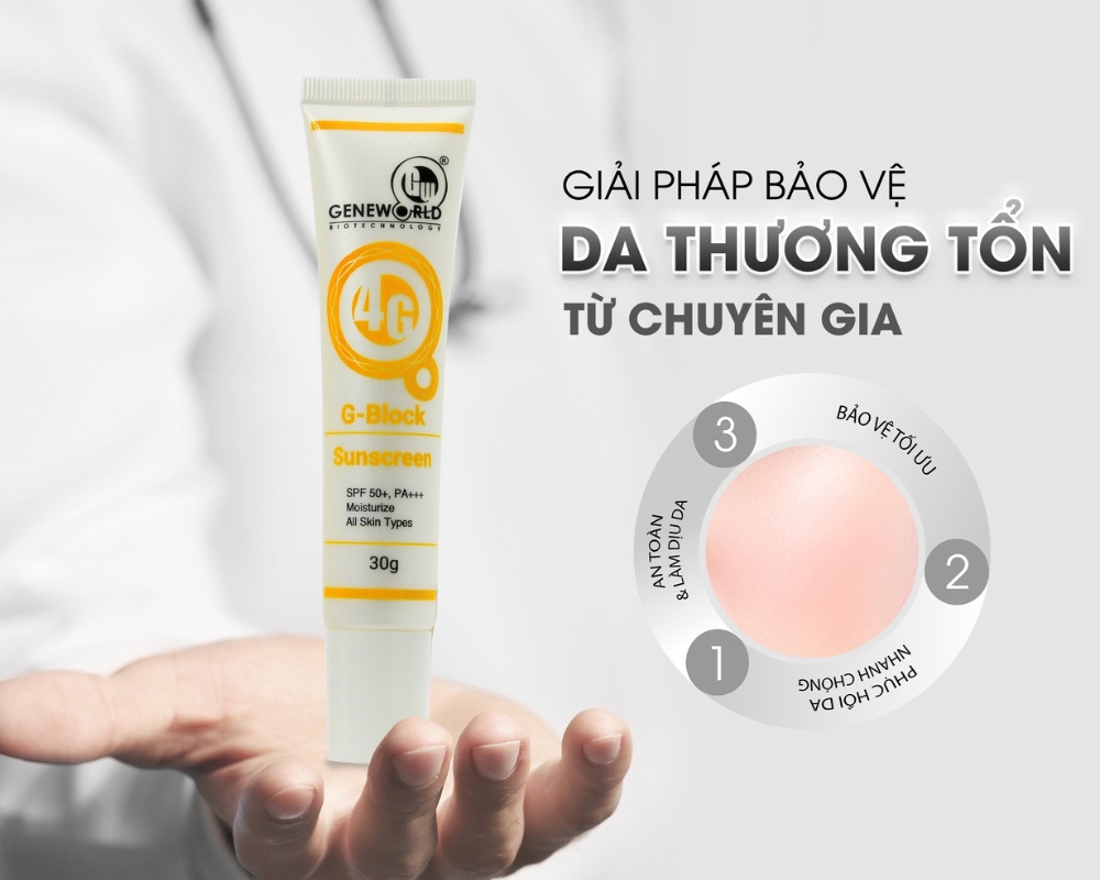 Được nghiên cứu và sản xuất để phù hợp với da nhạy cảm, dễ kích ứng, da thương tổn do công nghệ xâm lấn, kem chống nắng vật lý phổ rộng G - Block SPF 50+ PA+++ giúp phản xạ lại tia UV, bảo vệ da tối ưu, an toàn dịu nhẹ, không làm ảnh hưởng đến vết thương và da non. Sản phẩm hỗ trợ phục hồi thương tổn, ngăn tăng sắc tố sau viêm. Kết cấu dạng sữa lỏng thấm nhanh, không kích ứng, an toàn với mọi loại da.