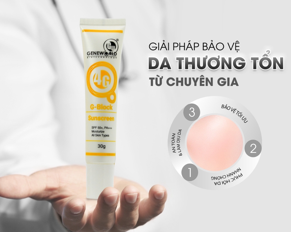 Được thiết kế dành riêng cho da nhạy cảm, dễ kích ứng, da thương tổn sau xâm lấn, kem chống nắng sun cream G - Block SPF 50+, PA+++ giúp bảo vệ da phổ rộng khỏi các tác nhân gây hại mà không ảnh hưởng đến vết thương/ da non. Sản phẩm được chiết xuất từ các thành phần lành tính, làm dịu da, đẩy nhanh quá trình phục hồi thương tổn hiệu quả. Chất kem dạng sữa, thấm nhanh vào da, không bết dính, không nhờn rít gây mụn.