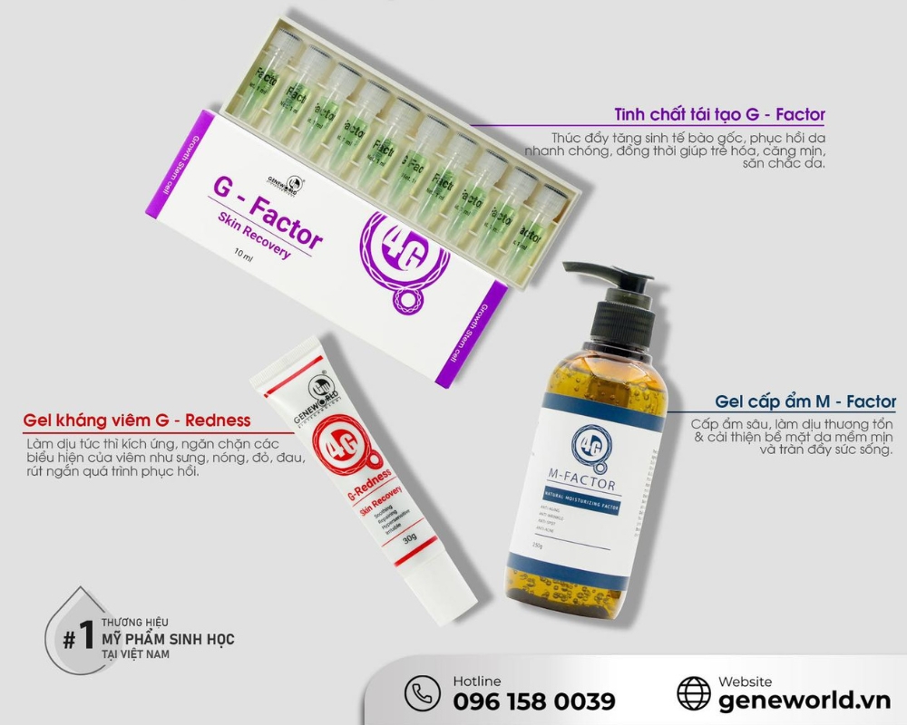 G-Factor là tinh chất tăng sinh tế bào gốc da nằm trong bộ 4G chăm sóc da xâm lấn. Sản phẩm ứng dụng công nghệ tăng sinh tế bào gốc từ tảo xoắn Spirulina, rau má lên men, nhân sâm lên men, Vitamin B5 (Panthenol), Niacinamide... giúp thúc đẩy tăng sinh tế bào gốc da, tăng cường sức khỏe cho làn da, hỗ trợ trẻ hóa và phục hồi da sau xâm lấn hiệu quả.