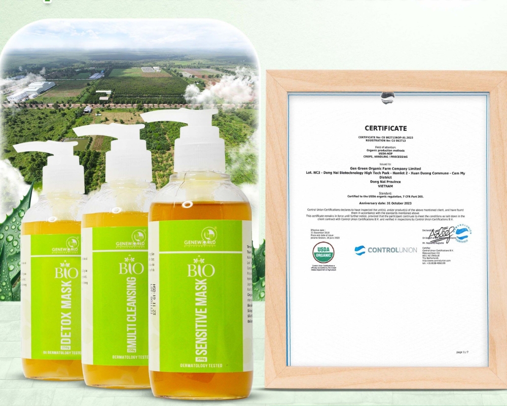 - Geneworld sở hữu nông trại hữu cơ Gen Green. Nông trại Gen Green được canh tác theo tiêu chuẩn hữu cơ của Bộ Nông Nghiệp Mỹ và đạt các chứng nhận Organic USDA, CU. Với vùng nguyên dược liệu Organic an toàn, Geneworld đảm bảo nguồn cung cấp sạch, từ đó cho ra đời những sản phẩm hữu cơ đảm bảo chất lượng, mang lại hiệu quả vượt trội cho người sử dụng.