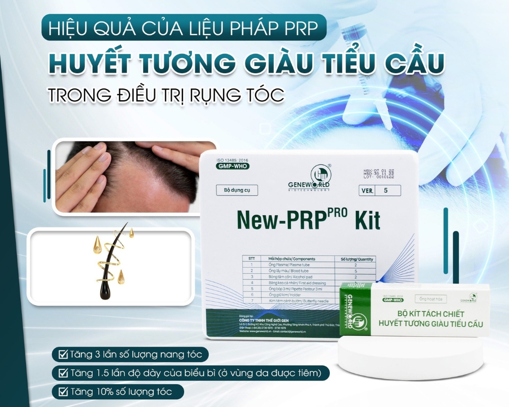 Được chứng minh là phương pháp điều trị rụng tóc hiệu quả do nhiều nguyên nhân rụng tóc ở nam gây ra, phương pháp tiêm huyết tương giàu tiểu cầu PRP là lựa chọn hàng đầu cho người rụng tóc, hói đầu mất kiểm soát. Qúy bệnh viện, phòng khám quan tâm đến phương pháp này cùng bộ KIT chuẩn y khoa, liên hệ Geneworld qua hotline/ zalo 0961580039 để được hỗ trợ nhanh nhất.