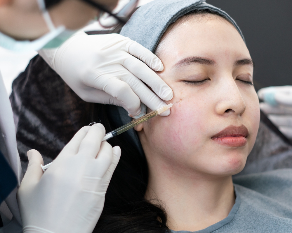 - Bước 5: Tiêm PRP khắp toàn bộ khuôn mặt theo phương pháp tiêm vi điểm (có thể kết hợp với lăn kim, bóc tách sẹo). Các mũi tiêm dàn đều trên da.