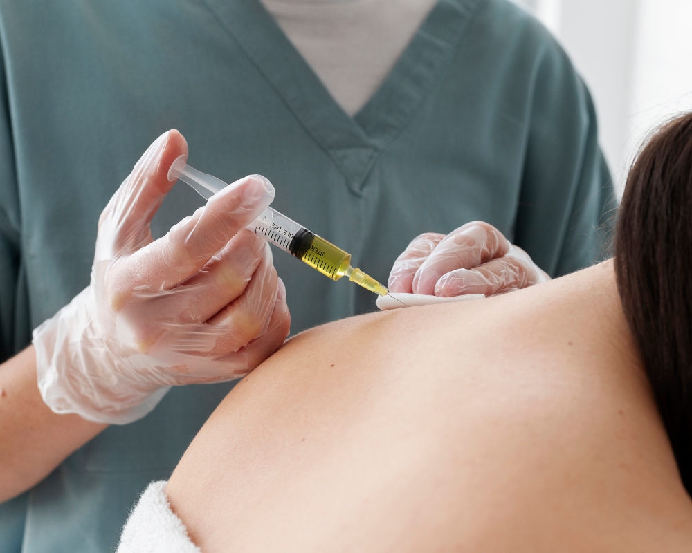 Sát khuẩn, làm sạch vùng da cần điều trị. Có thể gây tê bằng kem tê để giảm cảm giác đau khi tiêm.