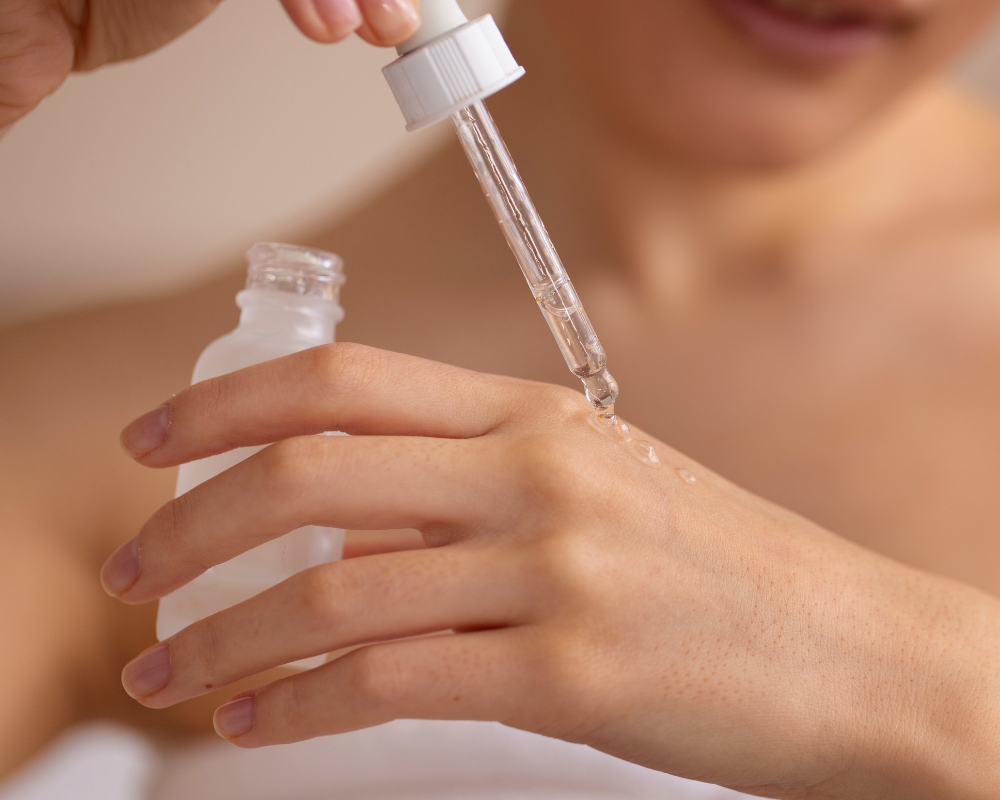- Lấy 2 - 3 giọt serum thoa lên toàn bộ khuôn mặt