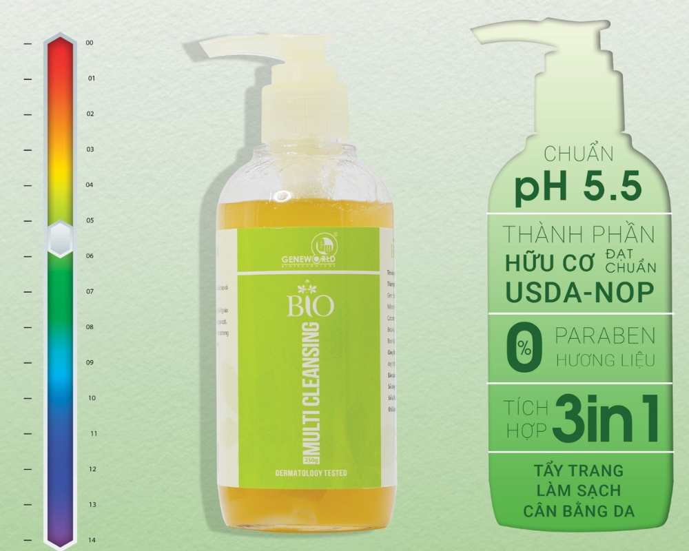 Được chiết xuất từ bảng thành phần lành tính đạt chứng nhận hữu cơ của Bộ Nông nghiệp Hoa Kỳ (USDA) và Liên minh Châu Âu (EU), sữa rửa mặt Bio Multi Cleansing mang đến hiệu quả 3in1: tẩy trang + làm sạch + cân bằng pH, an toàn với mọi loại da. Điểm nổi bật trong Bio Multi Cleansing là thành phần chứa nhiều enzyme đu đủ thúc đẩy quá trình thay da sinh học rất hiệu quả.