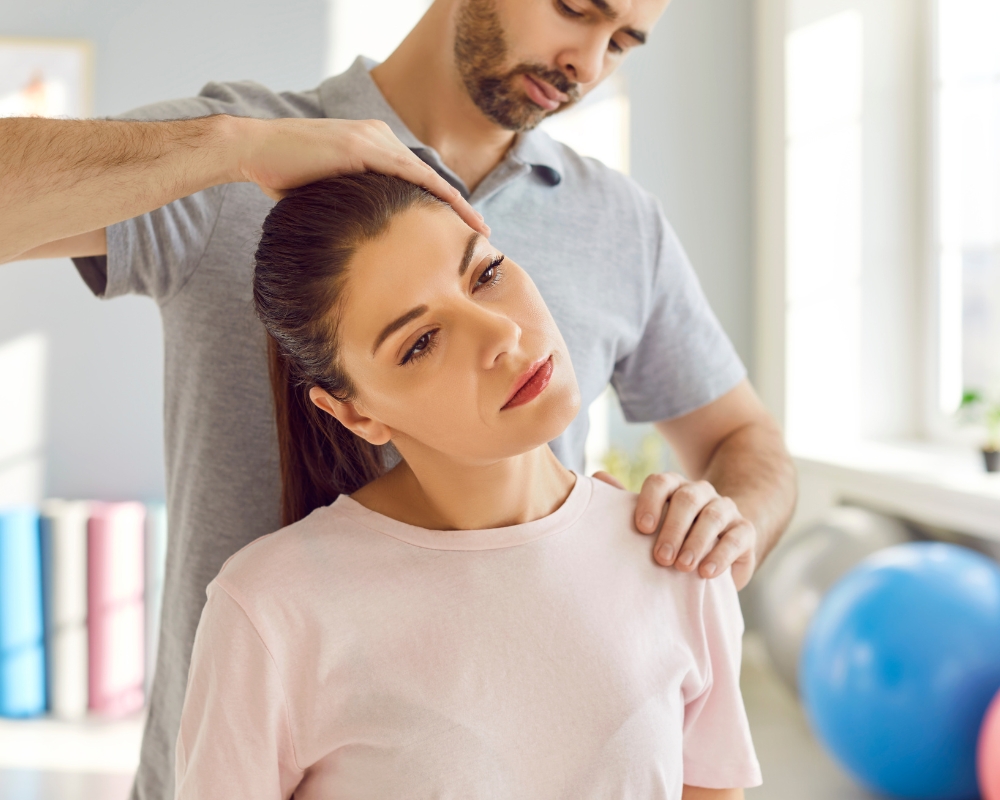 - Ngồi thẳng lưng, dùng tay đặt lên tai bên đối diện