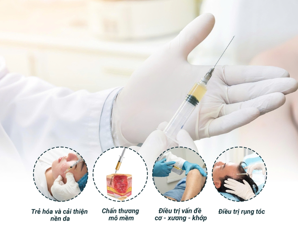 - Ứng dụng đa dạng: Tiêm huyết tương giàu tiểu cầu được ứng dụng trong da liễu (trẻ hóa da, trị sẹo rỗ), chỉnh hình (thoái hóa khớp), lành thương (vết thương mãn tính), chấn thương (viêm cơ, gân)...