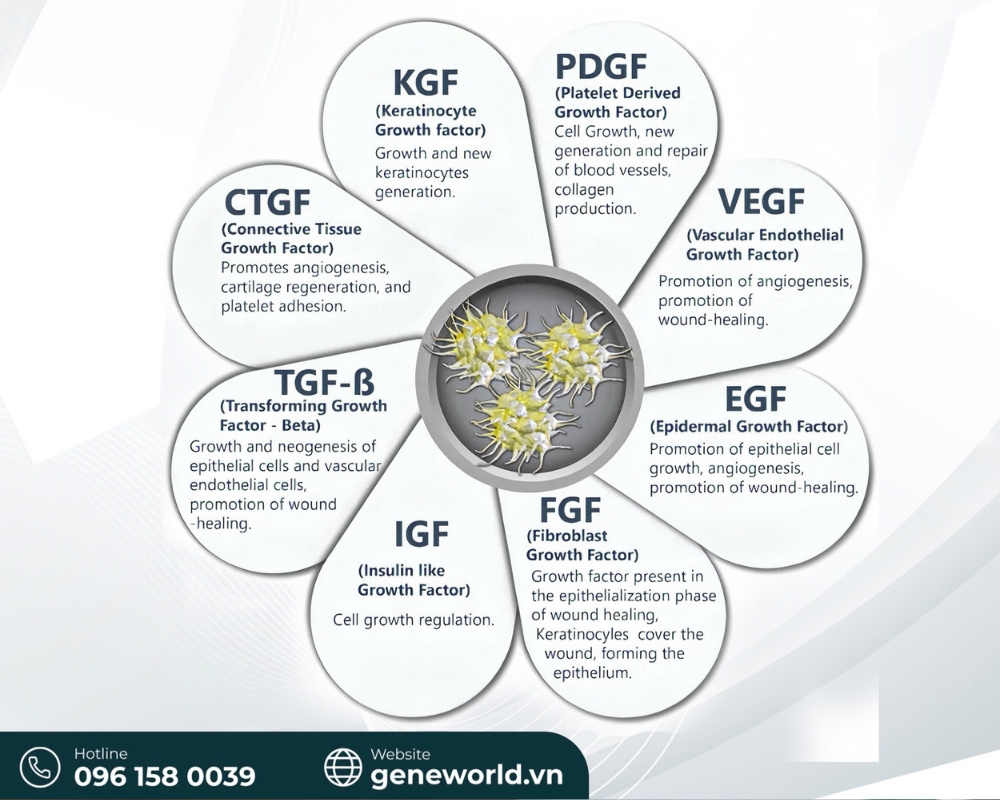 - FGF: Yếu tố tăng trưởng nguyên bào sợi, hỗ trợ tổng hợp DNA và kích thích tăng sinh tế bào, hình thành mạch & thúc đẩy chữa lành vết thương nhanh chóng.