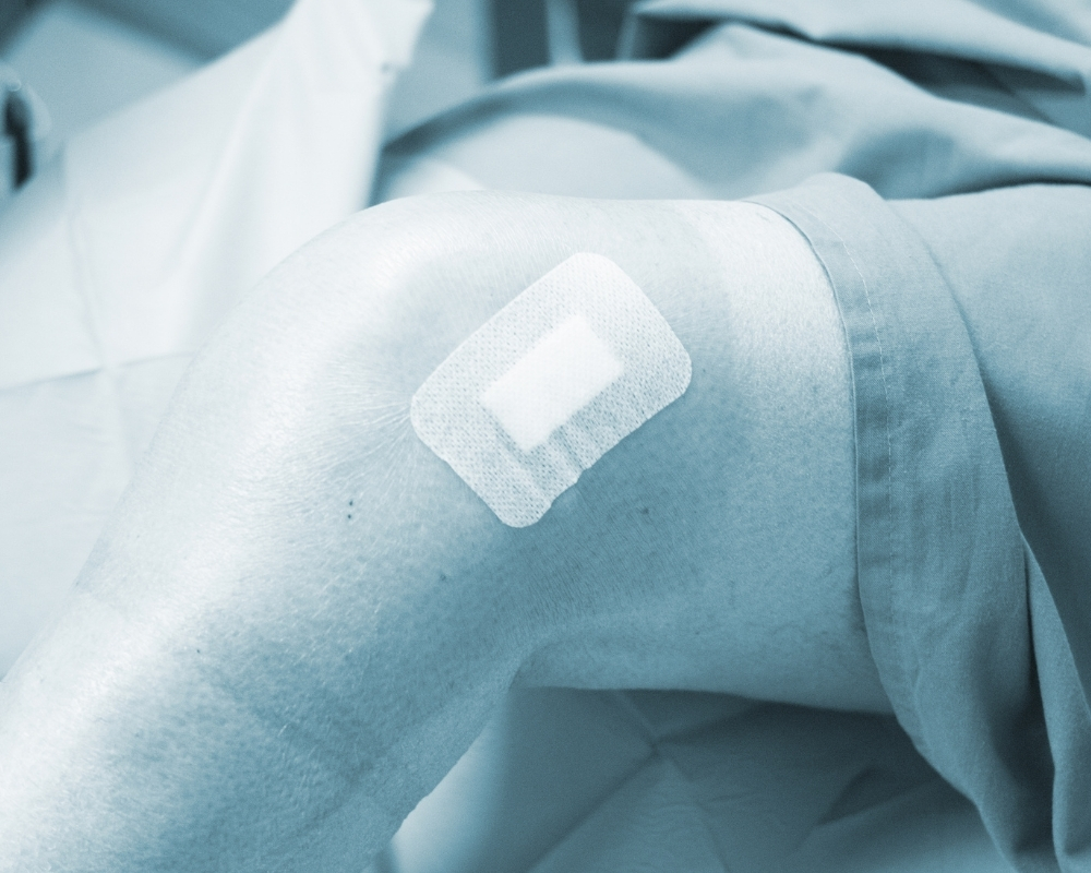 Băng chỗ tiêm, hướng dẫn bệnh nhân gấp duỗi thụ động khớp gối ngay sau tiêm 3 lần và giữ khô vị trí tiêm trong 24 giờ. Bệnh nhân cần theo dõi vùng tiêm, nếu có biến chứng bất thường, liên hệ bác sĩ để được hướng dẫn ngay.